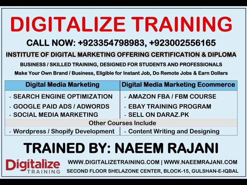 Digitalize Training is one of the leading Digital Marketing Institute in Karachi Pakistan. We provide various Digital Marketing Training programs that cover SEO Training, Google Ads PPC Training, Social Media Marketing Training, Amazon / eBay Webstore Management Training, Affiliate Marketing Training, WordPress Development Training, and much more. DigitalizeTraining has very experienced and qualified teachers who have many years of experience in multiple fields of Digital Marketing. We offer complete theory and 100% practical of these Digital Marketing programs at very affordable prices. Students and professionals can easily join and learn from our Digital Marketing Training programs to groom their careers or either their own online business or a job as a professional in various fields of Digital Marketing.